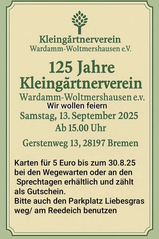 Am 13. September 2025 wird unser Kleingartenverein 125 Jahre alt! Dazu möchten wir euch einladen.